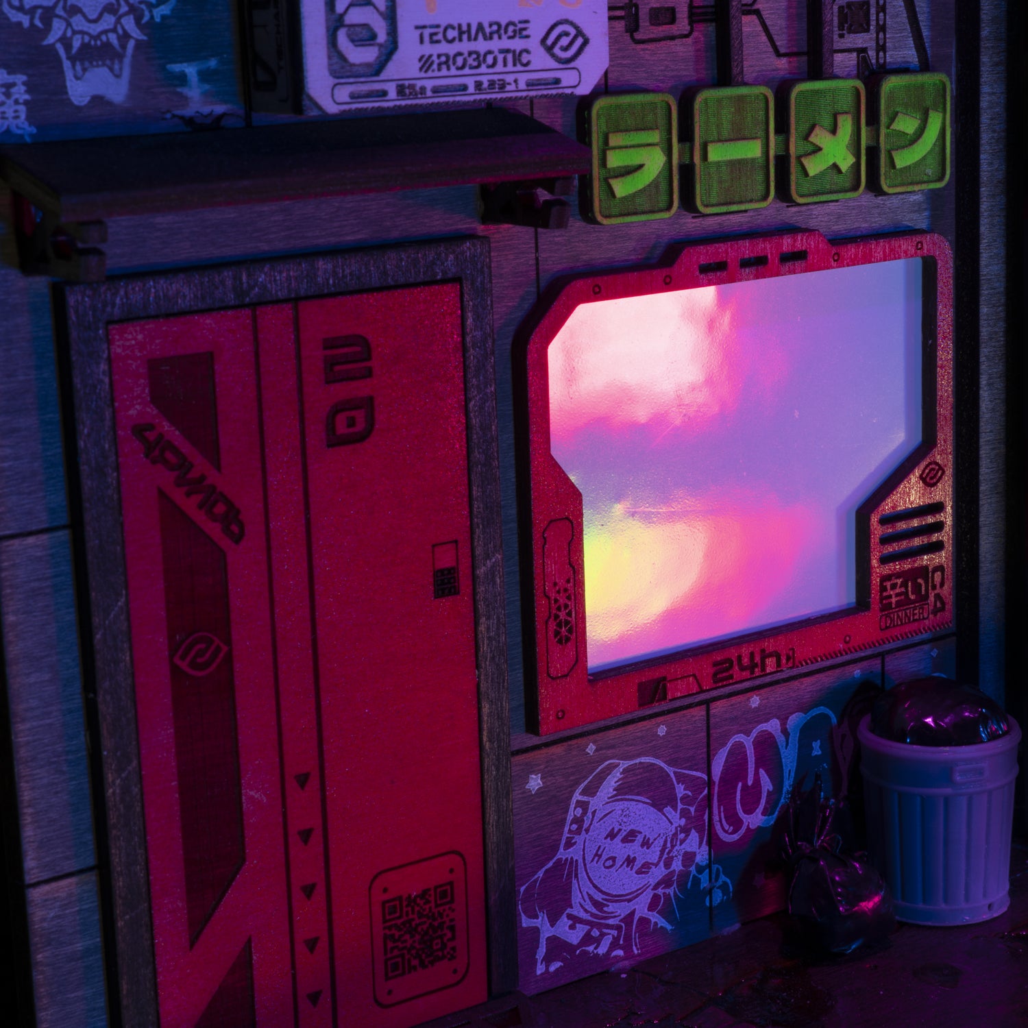 Introducing our one-of-a-kind Handmade Cyberpunk MiniAlley Booknook! This unique booknook will add a touch of futuristic style to your bookshelf.