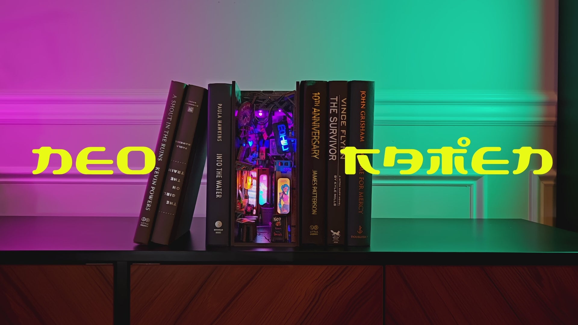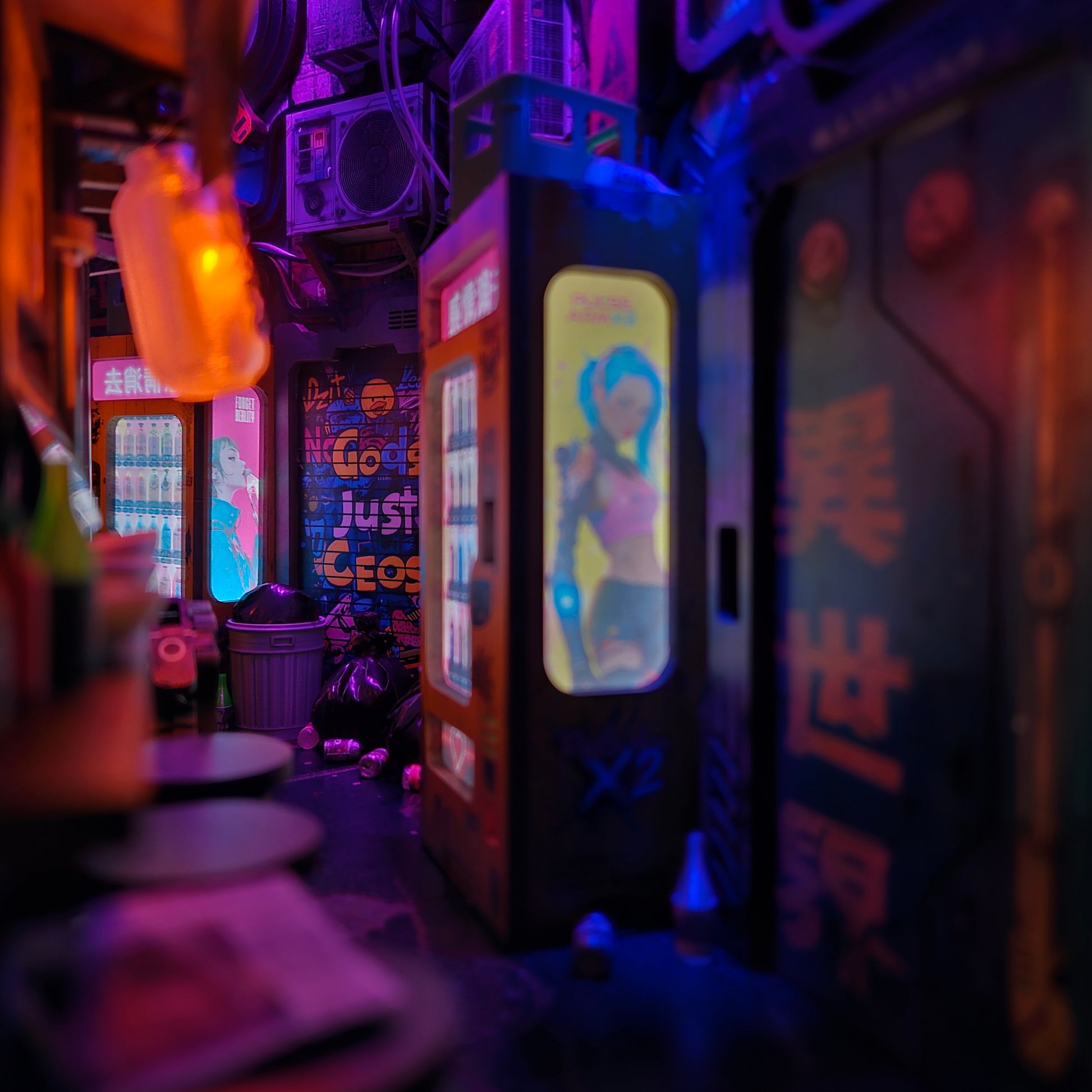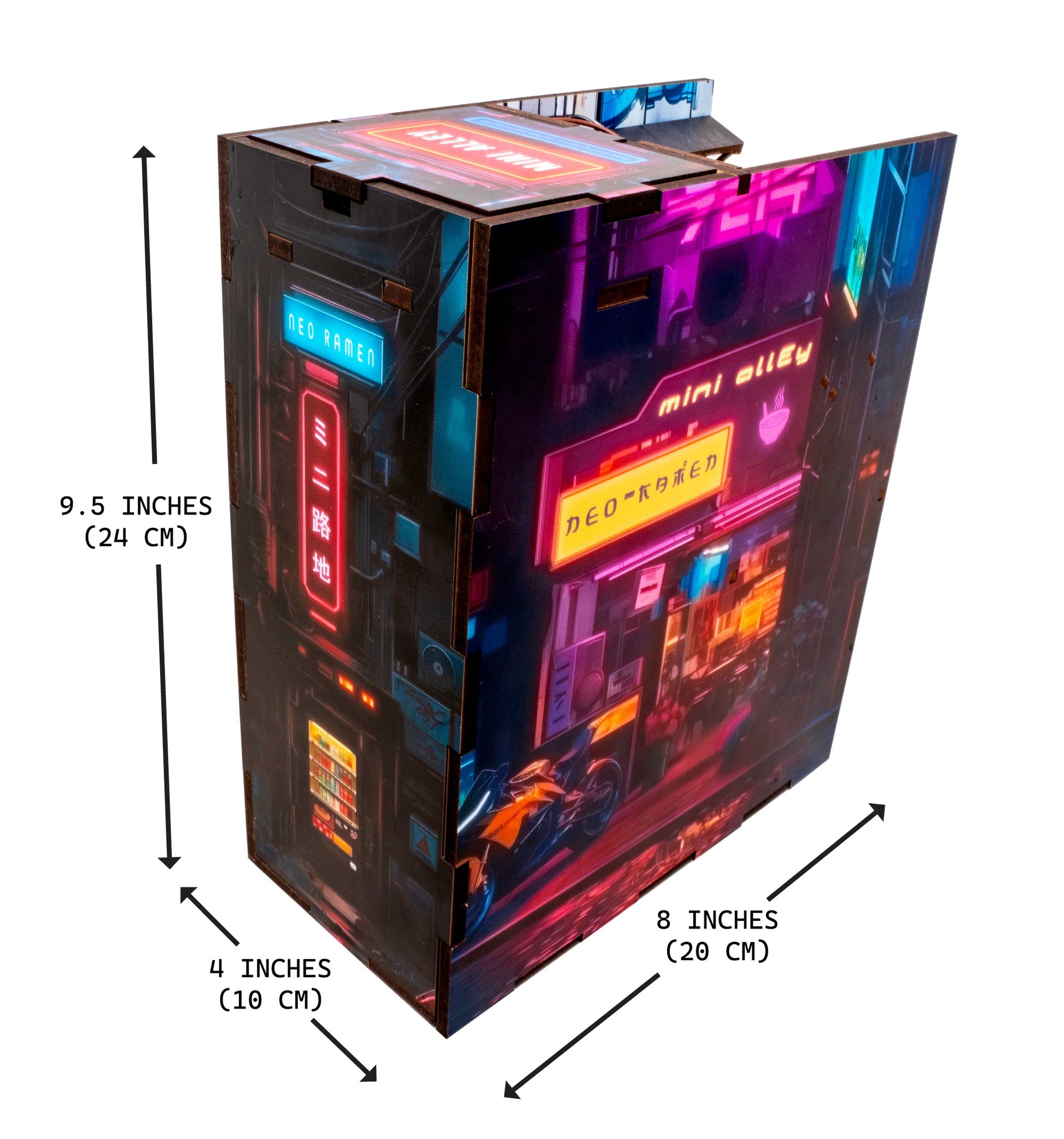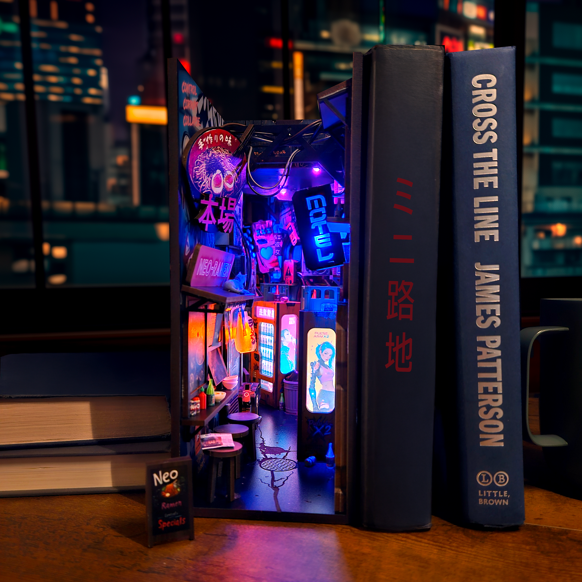 A DIY cyberpunk booknook diorama, designed for collectors, model enthusiasts, and sci-fi fans. Designed in the USA and crafted with precision engineering, premium materials, and easy plug-and-play assembly, it’s more than a display—it’s an immersive world waiting to be built.