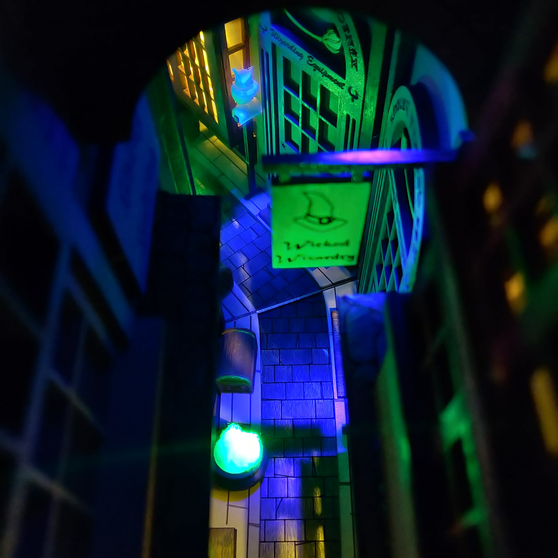 The Wizard miniAlley is a high quality, custom handmade bookshelf insert that captures an enchanting and mystical wizard shop alleyway. One can image themselves strolling through this very alley during a breezy summer night, browsing wizard potions and wares through the variety of shop windows, peeking into mysterious glowing cauldron, or playing with the beautiful white owl.